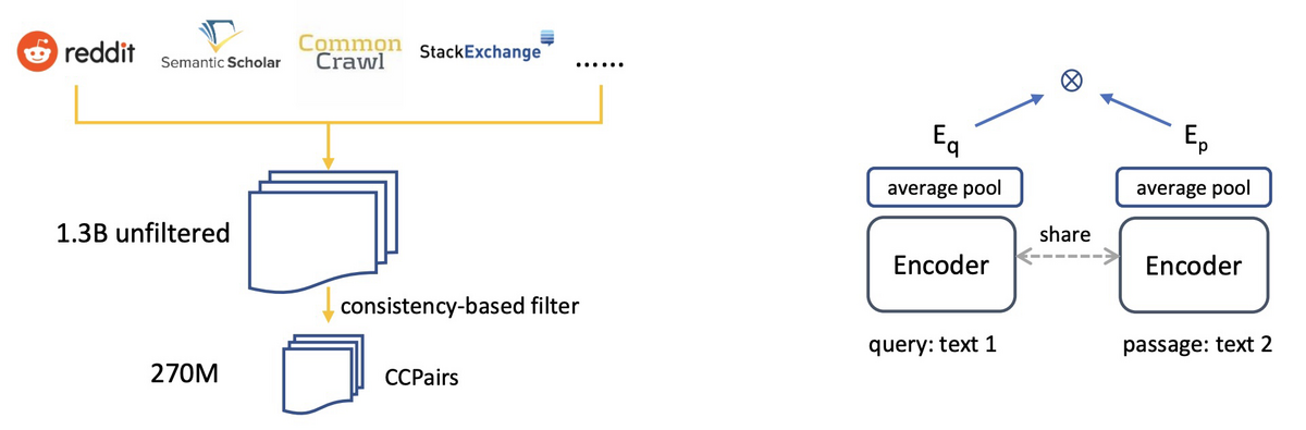 CCPairsはWeb上から収集されており、具体的にはRedditの(投稿、コメント)、StackExchangeの(質問、いいねされた回答)、Wikipediaの(エンティティ名+セクションタイトル、パッセージ)、科学技術系論文の(タイトル、アブストラクト)、CommonCrawlの(タイトル、パッセージ)です。集めたデータはフィルタリングして270M件まで減らしたあと、対照学習に使い、その後NLI、MS Marco、NQを使って学習しています。なお、学習時にquery:とpassage:というプレフィックスを付けているので、予測時にも付けることが推奨されています。